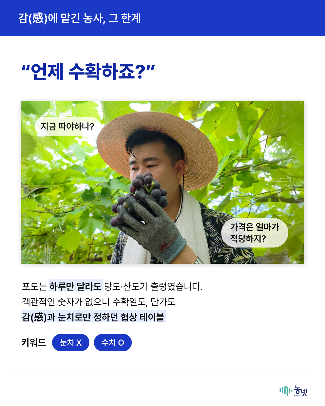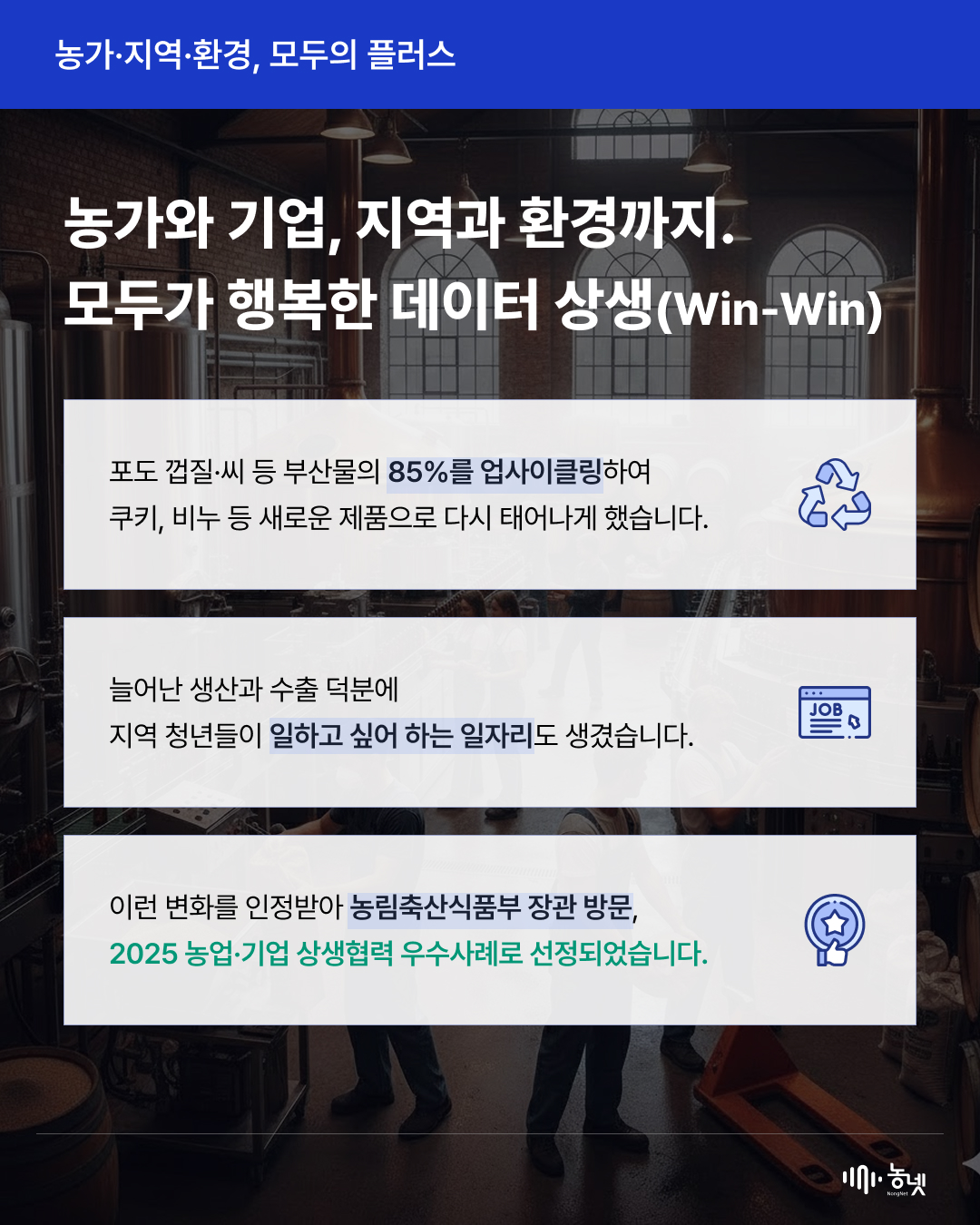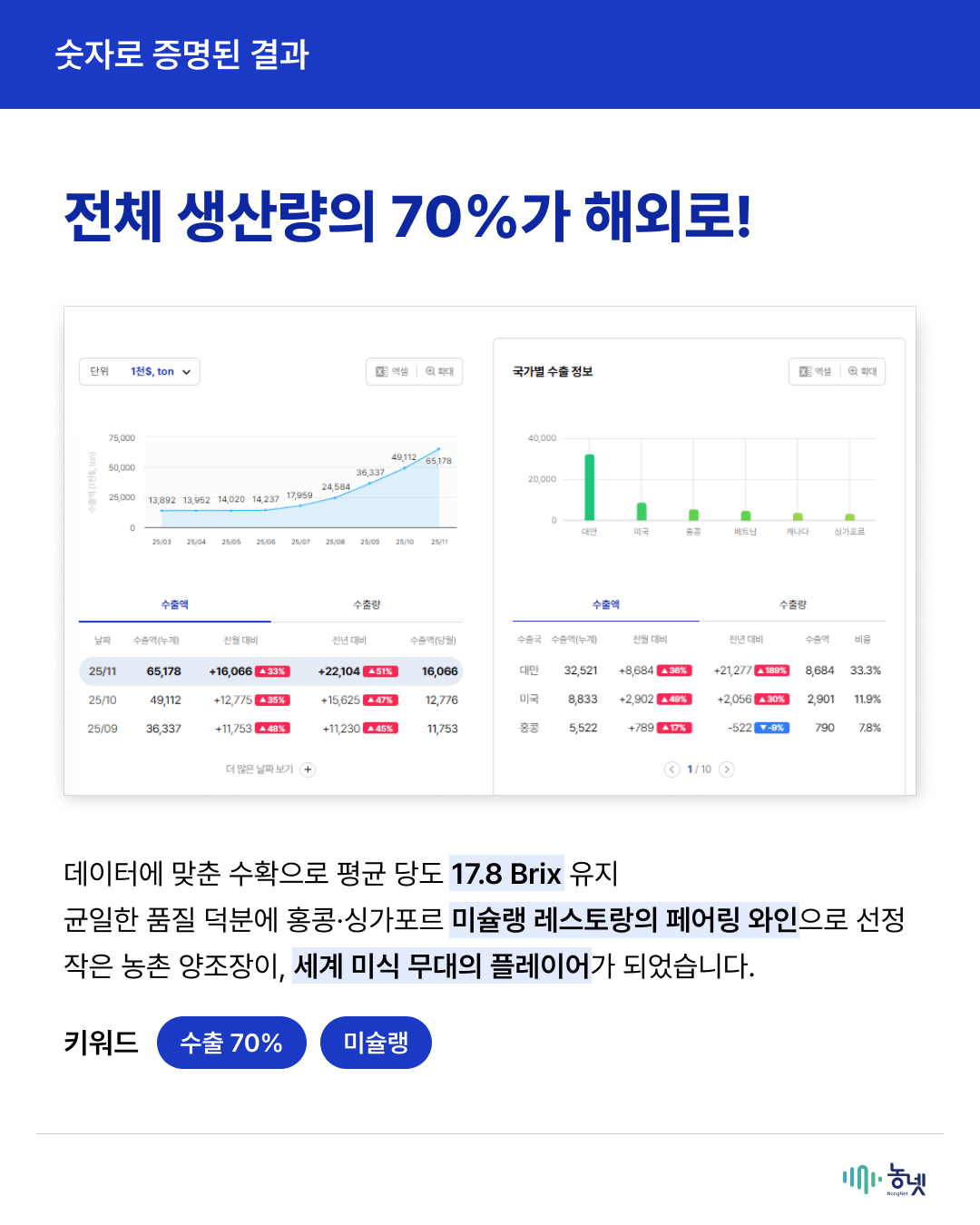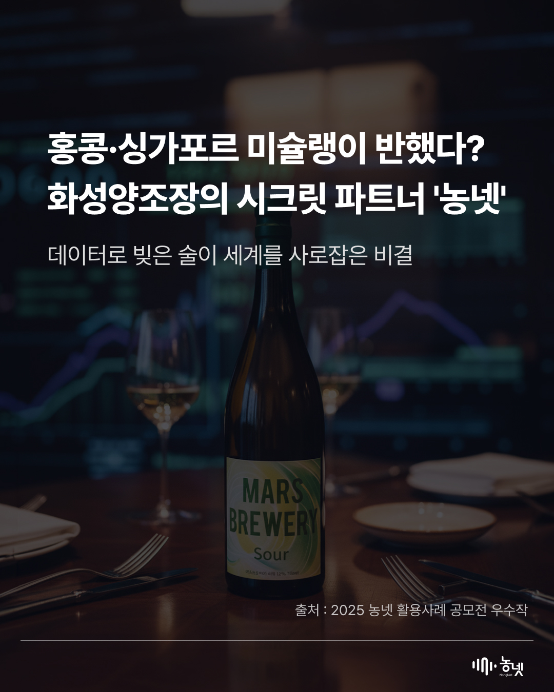공지사항 새로운 농넷 소식을 만나보세요! [2025년 농넷 활용사례 수기 공모전 대상 수상작] 데이터로 빛은 술이 세계를 사로잡은 비결 관리자 2025-12-31 16:31 조회수 146 [해당 카드뉴스는 2025년 농넷 활용사례 수기 공모전 수상작을 활용해 재가공 하였습니다.] 이전글2025년 농넷 활용사례 수기 공모전 결과 발표 목록 [2025년 농넷 활용사례 수기 공모전 우수상(생산분야) 수상작] 복숭아 농장 AI 비서 구축기다음글
